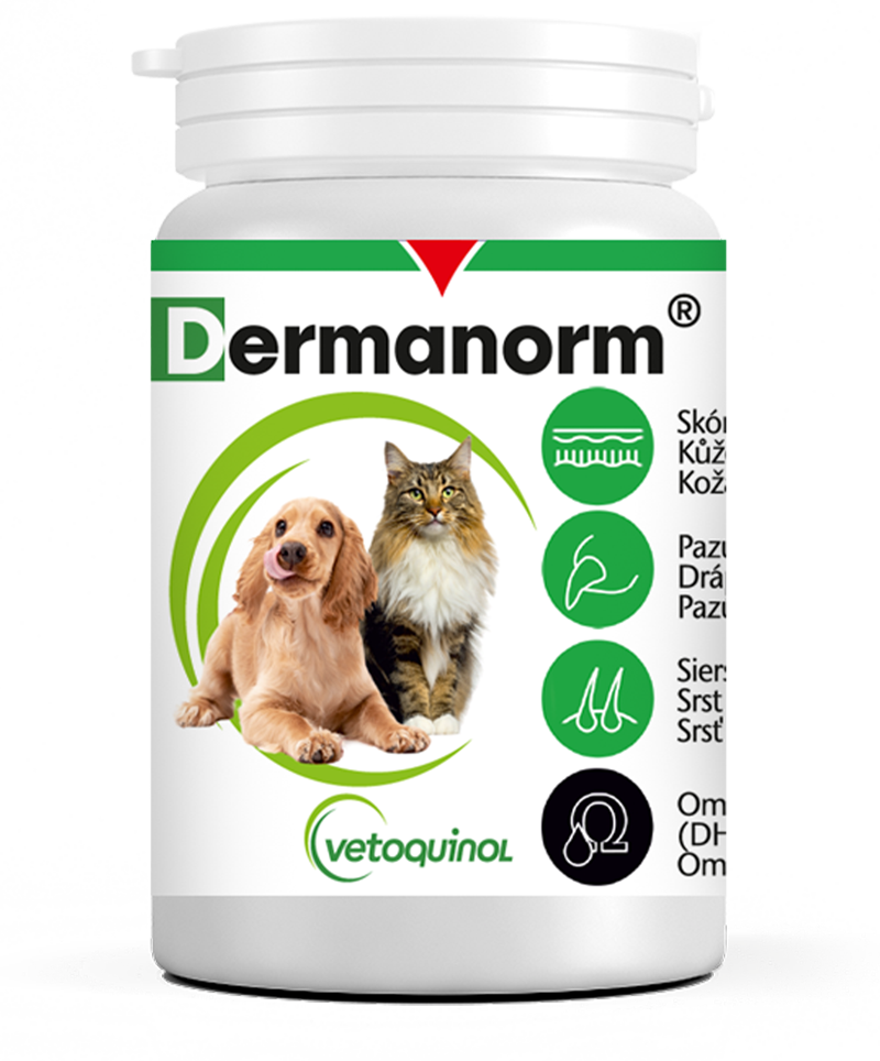 Dermanorm® spełnia zapotrzebowanie na niedobory omega-3 i omega-6, które są konieczne dla prawidłowego funkcjonowania skóry i jej wytworów (sierść, pazury itp.).